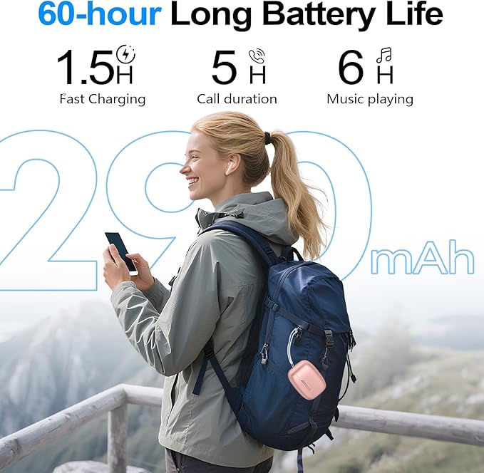 - 60 Hours Battery Life for Uninterrupted Listening:Say goodbye to battery anxiety! Enjoy 12 hours of non-stop playback on a single charge, extended to 60 hours with the compact charging case. Commuting, workouts, or travel—your music and calls never stop. With fast charge, just 10 minutes of charging delivers 2 hours of playtime, so your rhythm never break