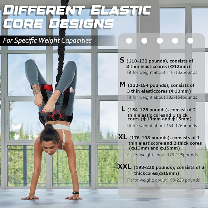 • 5 Adjustable Resistance Levels for All Fitness Levels – This bungee fitness set offers progressive resistance with 5 weight classes (110lbs, 132lbs, 154lbs, 176lbs, 198lbs) to match different body weights and training intensities. Each class features varying elastic core thickness (Φ12mm–Φ15mm) for customized workouts—ideal for beginners to advanced athletes.
