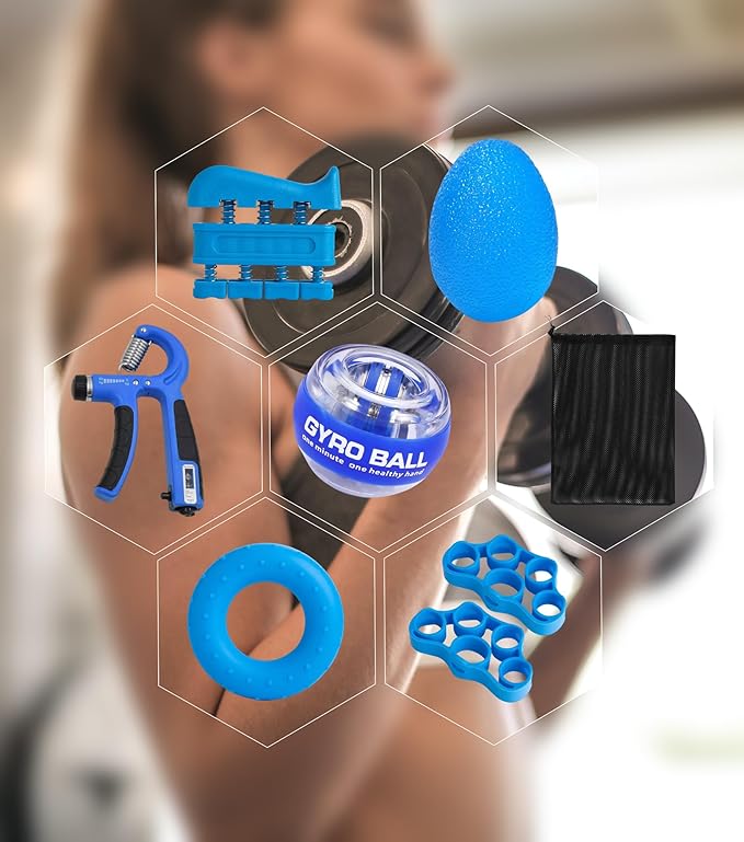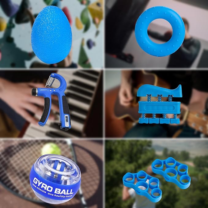 - [Hand Grip Strengthener Workout Kit (8 Pack)]: Forearm Grip Adjustable Resistance Hand Gripper, Finger Exerciser, Finger Stretcher, Gyro Ball,Grip Ring & Stress Relief Grip Ball for Athletes.