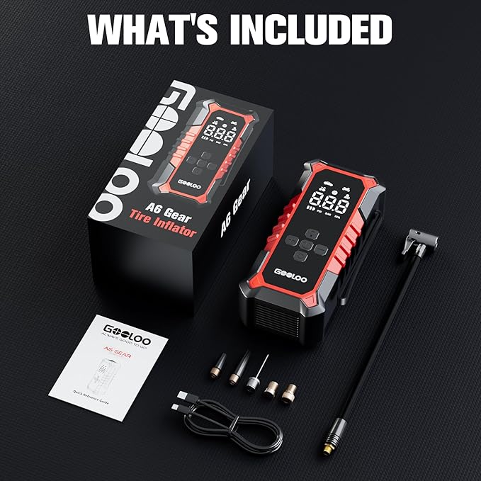 - QUICK & EFFORTLESS INFLATION: GOOLOO A6 Gear cordless air pump for car tires is equipped with a 21,000 RPM ultra-powerful motor, delivering up to 160 PSI. It can inflate a 205/55 R16 car tire from 30 to 36 PSI in less than 1 minute—perfect for daily maintenance or emergencies, helping you stay safe on the road.