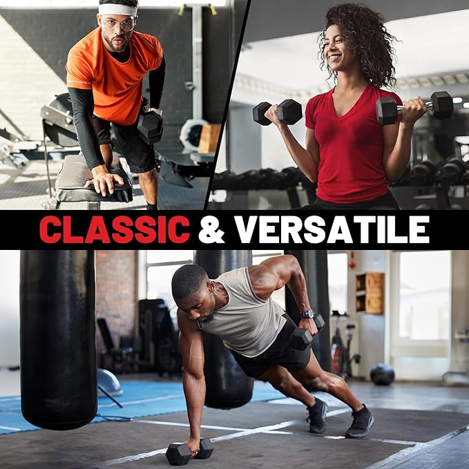 - RUBBER COATED TO PROTECT FLOORS: Encased in premium virgin rubber, these rubber hex dumbbells protect floors and equipment from scratches while reducing noise.Durable and reliable, this free weights dumbbells set is ideal for both beginners and advanced users.