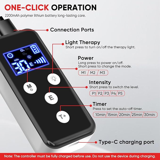 - 【Personalized Treatment】Heated knee brace can be used by simply connecting the controller (not the power supply). Red light therapy for knee pain relief have 5 timer modes (10-30 minutes optional), you can switch between a short nap or deep therapy at will, meeting the needs of office workers, sports people, the elderly and other scenarios. Note: The controller must be fully charged before use. Do not use the device during charging.