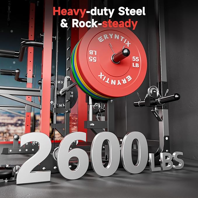 - 🔻2600LBS Heavy-Duty Capacity---Constructed with reinforced Q235 steel, this rack supports up to 2600 lbs, ensuring stability and safety during heavy lifts. Linear bearings provide smooth barbell motion for a wide range of users.