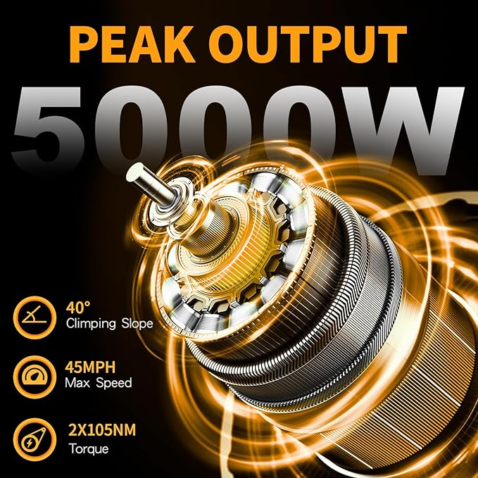- Dual Motor System: The PHILODO Forester electric bike is equipped with dual motors delivering 5000W peak power (2x 2500W) and a massive 210Nm of torque (2x 105Nm). This powerful motor provides the bike with strong power and climbing ability, easily conquering steep 40° inclines and rugged terrain, boosted a top speed of 45 MPH.