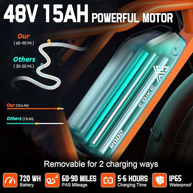 - 𝗦𝗺𝗮𝗿𝘁 𝗕𝗮𝘁𝘁𝗲𝗿𝘆 𝗦𝘆𝘀𝘁𝗲𝗺: This adult electric bikes is equipped with a waterproof 48V/15AH removable battery with two charging methods and energy-saving technology, which can travel more than 60 miles per charge. It can be fully charged in 5 hours, making it ideal for commuting or off-grid adventures