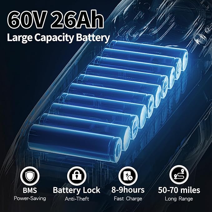 - 60V 26AH Battery Ebikes: With a massive 60V 26AH battery capacity, it provides a range of up to 50-70 miles per charge. Equipped with a battery lock and 8-9hours fast charging. The waterproof removable battery allows you to install it while riding, reducing the risk of theft and ensuring long-lasting performance for all your adventures.