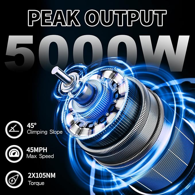 - Powerful Motor Electric Bike: 5000W peak high-speed brushless motor & 45MPH top speed. 210Nm of torque offers strong climbing power. 40° Max climbing ability.The 21-speed gear system can conquering any terrain with confidence.Including snow, beache.