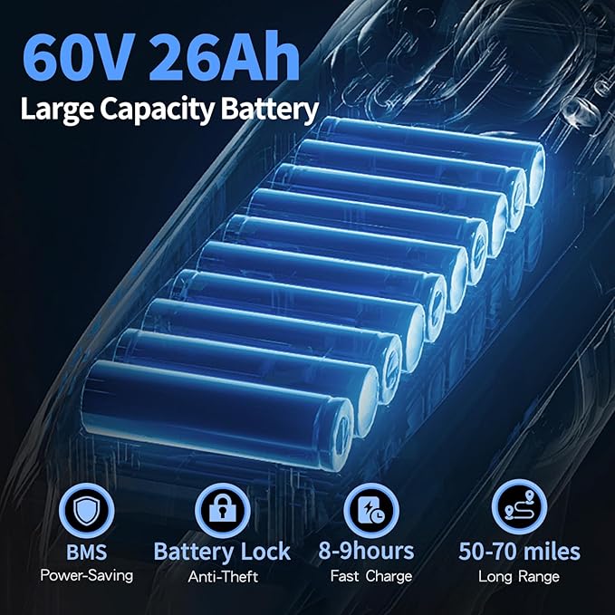 - 60V 26AH Battery Ebikes: With a massive 60V 26AH battery capacity, it provides a range of up to 50-70 miles per charge. Equipped with a battery lock and 8-9hours fast charging. The waterproof removable battery allows you to install it while riding, reducing the risk of theft and ensuring long-lasting performance for all your adventures.