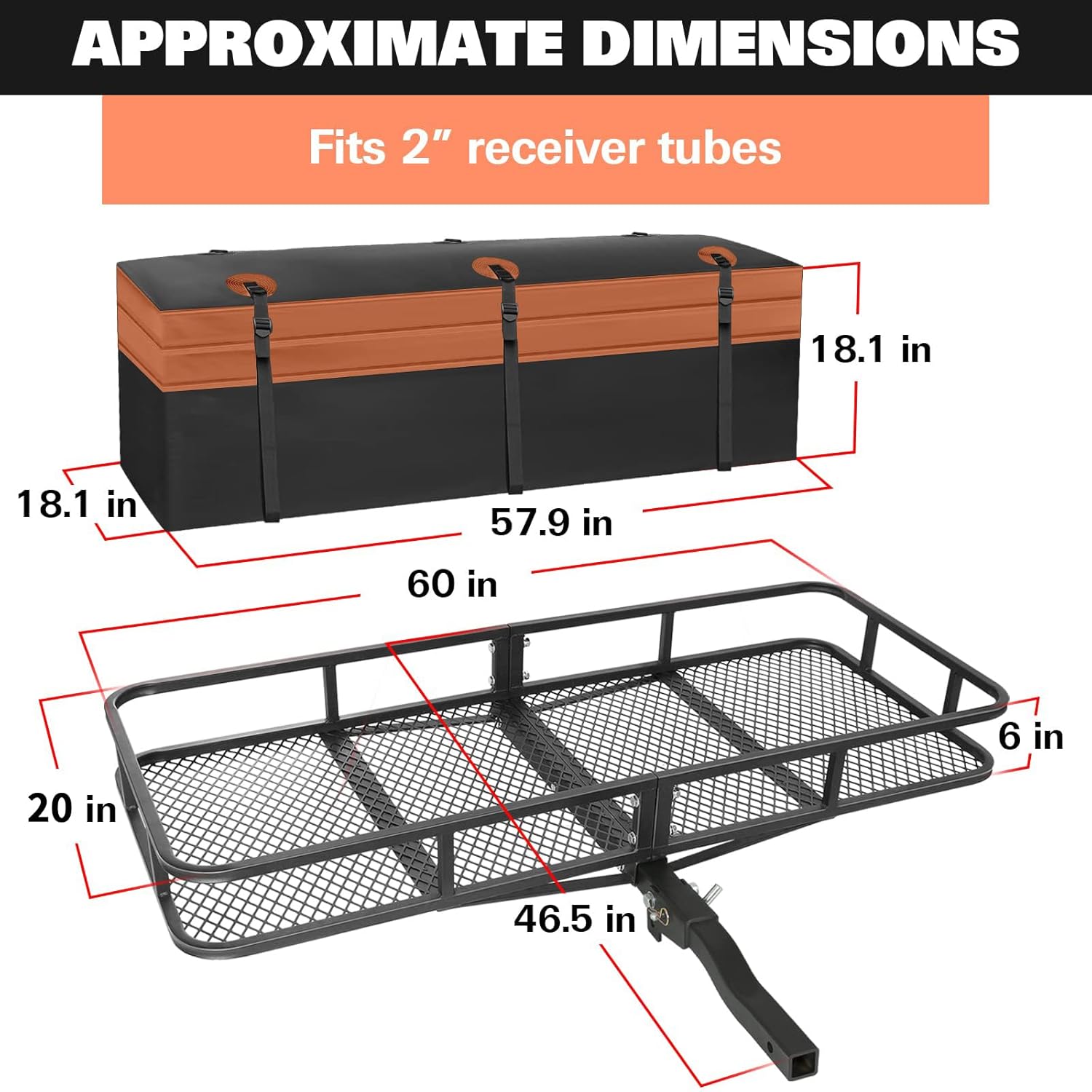 - Overall Dimensions: The hitch cargo carrier measures 60" (L) x 20" (W) x 6" (H), providing plenty of space for your gear. It’s perfect for camping, road trips, or moving, ensuring you won’t have to worry about running out of storage space.