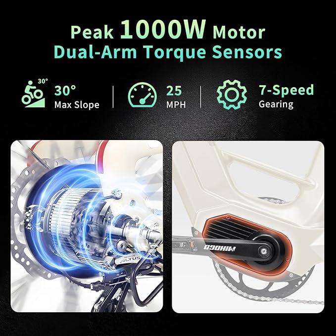 - 【Peak 1000W Powerful Motor & 25MPH Speed】The electric bike is powered by a Peak 1000W brushless motor with Middle torque control, effortlessly reaching 25MPH, and excellent climbing ability up to 30°.Whether commuting or exploring off-road trails, this powerful ebike helps you conquer every terrain with confidence.