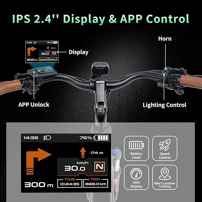 - 【Smart LCD Display & App Connection】The Smart LCD display keeps you informed with speed, distance, battery level, and mode at a glance. Connect your electric bicycle with the smart app for convenient control of the e-bike. The App also provides more personalized ebike's settings.