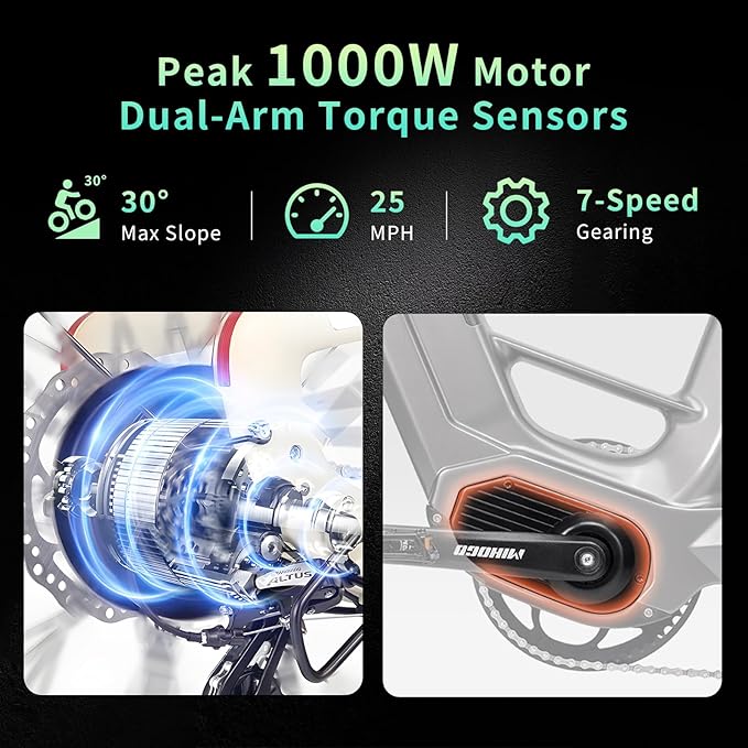 - 【Peak 1000W Powerful Motor & 25MPH Speed】The electric bike is powered by a Peak 1000W brushless motor with Middle torque control, effortlessly reaching 25MPH, and excellent climbing ability up to 30°.Whether commuting or exploring off-road trails, this powerful ebike helps you conquer every terrain with confidence.