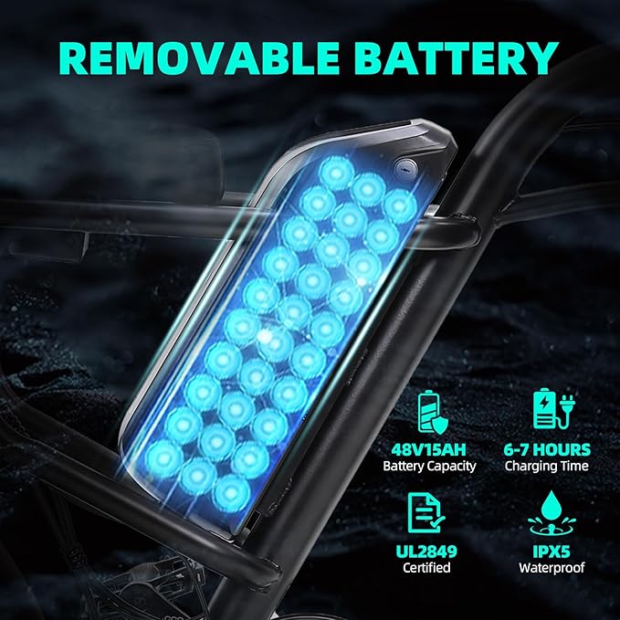 - 【Battery Capacity & Range】:The 48V 15AH lithium battery delivers 37 miles pure-electric range (75 miles pedal-assist) with 2,200+ charge cycles - redefining endurance for adult electric bicycles