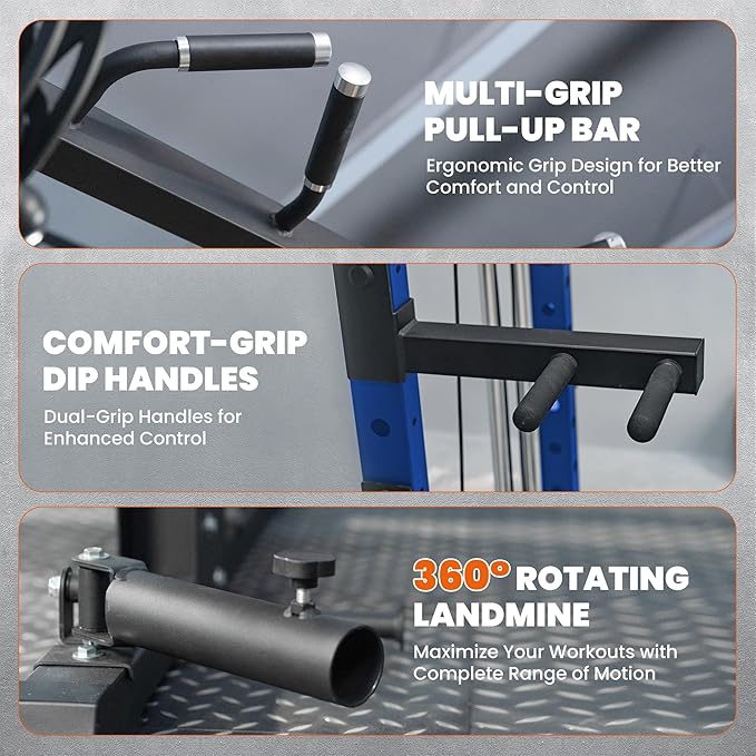 - Complete Strength Package: Includes 18 professional attachments: Multi-grip, 2 Sandwich j-cup, dip bars, safety bar, 2 handles, lat pulldown pedal, 360° landmine, 2 Olympic barbell holders, 4-post plate storage, dual cable bars, landmine pivot, lat bar, cable bar, T bar, 6 band pegs, clip, tricep rope, squat pad and lifting grips.