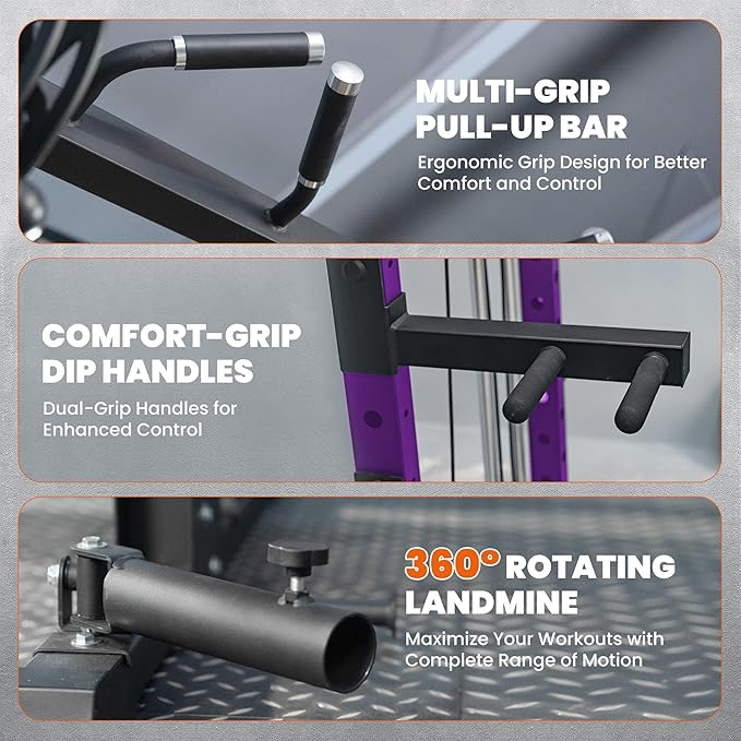 - 7-in-1 Functional Trainer Transition: Seamlessly between Smith rack exercises, high-low cable pulley workouts, T-bar rows, landmine rotations, weighted dips, multi-grip pull-ups, and band resistance training—all without re-racking weights. Targets every muscle group from chest flys to deadlifts. And all weight holders, including those on the cable crossover system, support both 1" and 2" weight plates.